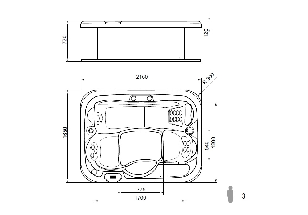 MySpa 216/165 designed by Glass Lab is a portable spa with 22 whirlpool jets, chromotherapy, heater (3kW), pumps 1 speed (3 hP), recirculation pump, cartridge filters (15m²), ozone system, headrest. Heater exchanger and Bluetooth audio kit as optional. Grey insulating cover compulsory. On request, it is also available a version for built-in installation.