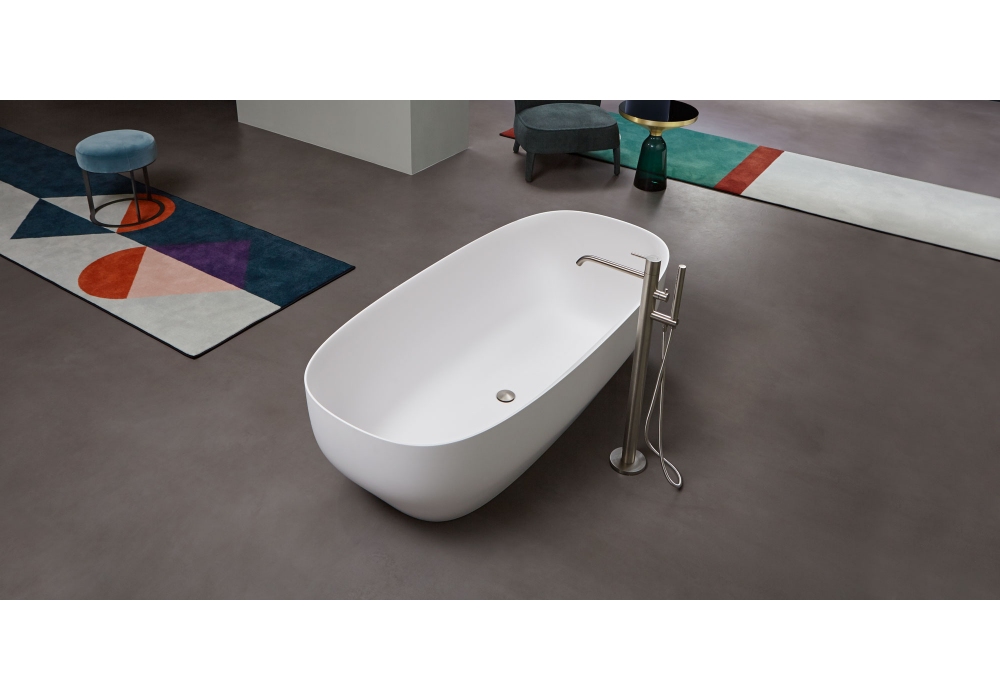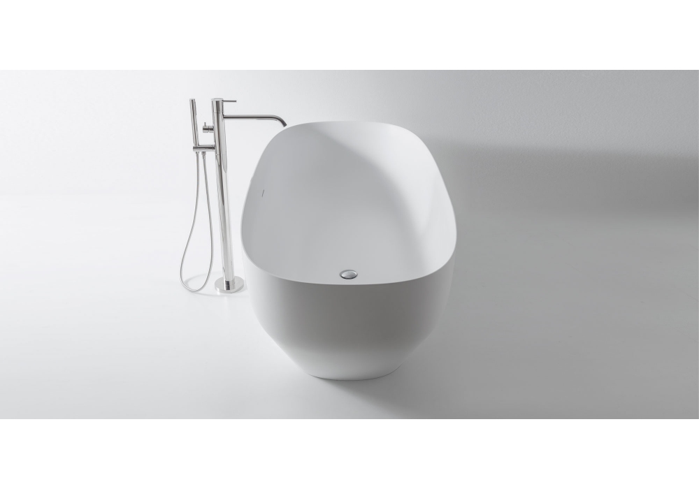 Ago designed by Mario Ferrarini for Antonio Lupi is an oval bathtub in Cristalplant, paintable externally, complete with drain with click-clack pressure drainage system, siphon and flexible hose.