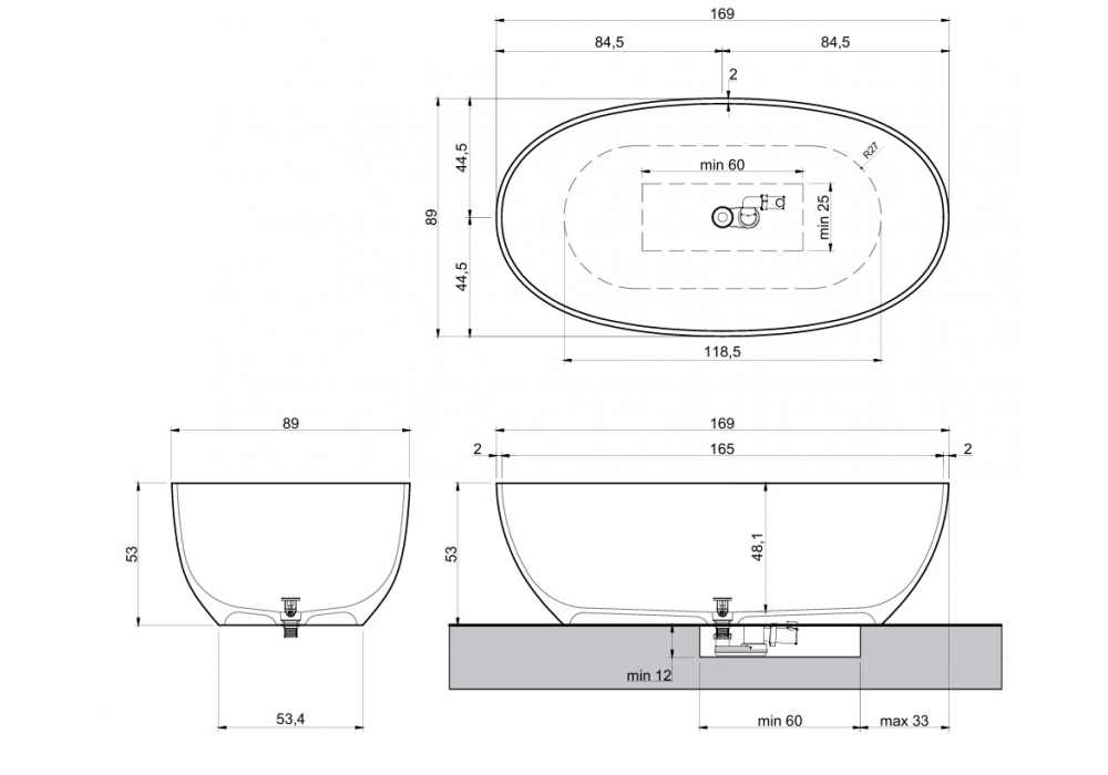Reflexlight designed by Antonio Lupi is an oval bathtub in Flumood, paintable externally, in Colormood paintable internally and externally, complete with drain with invisible automatic overflow, siphon and flexible hose.