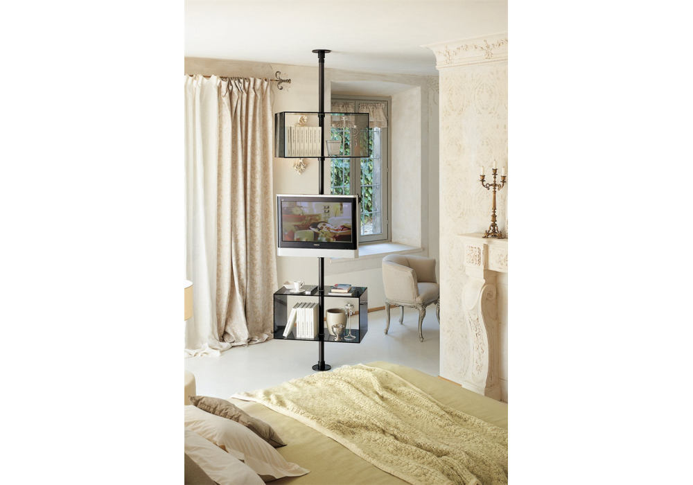 Domino TV designed by T. Colzani for Porada is a column made of metal on the wall or ceiling equipped with a metal plate for fixing LCD or plasma televisions. On the back there are 8 holes for the passage of cables. It is possible to customize the composition with glass containers or wooden shelves.