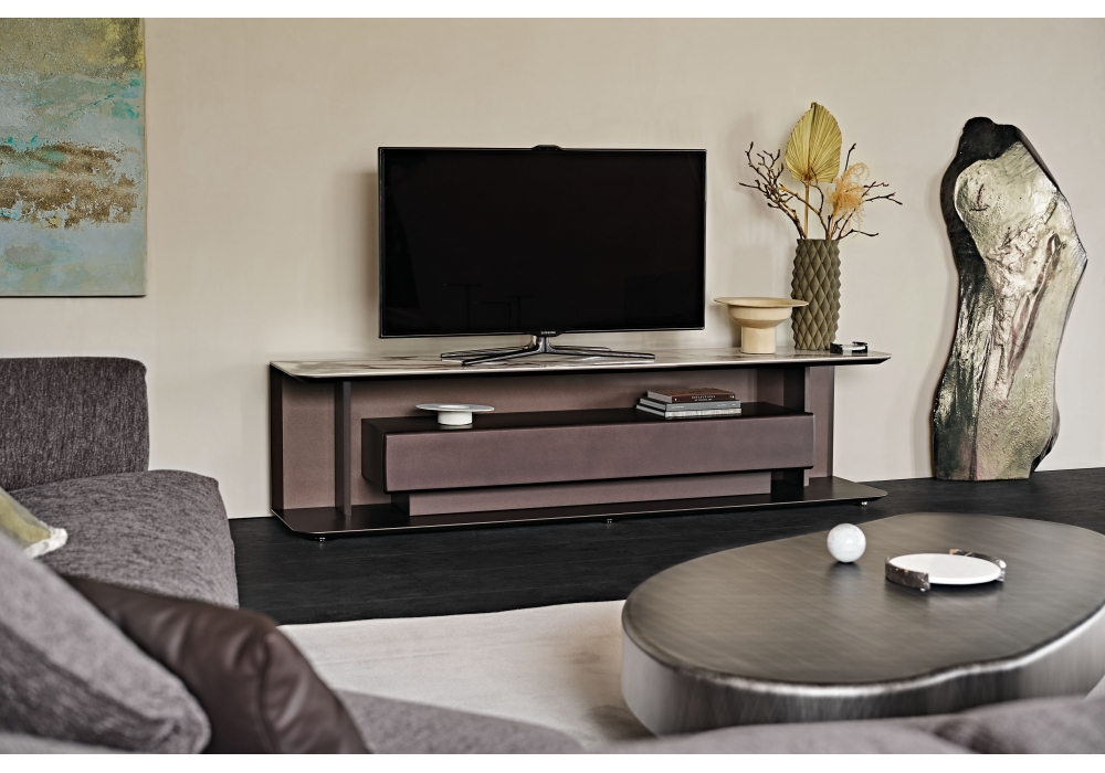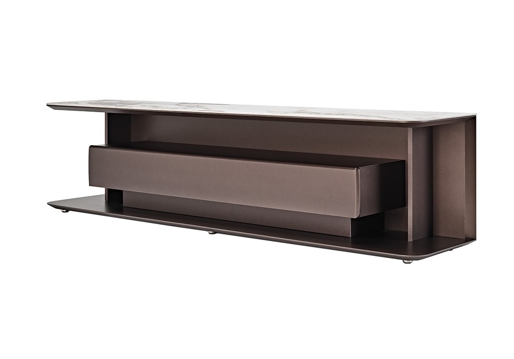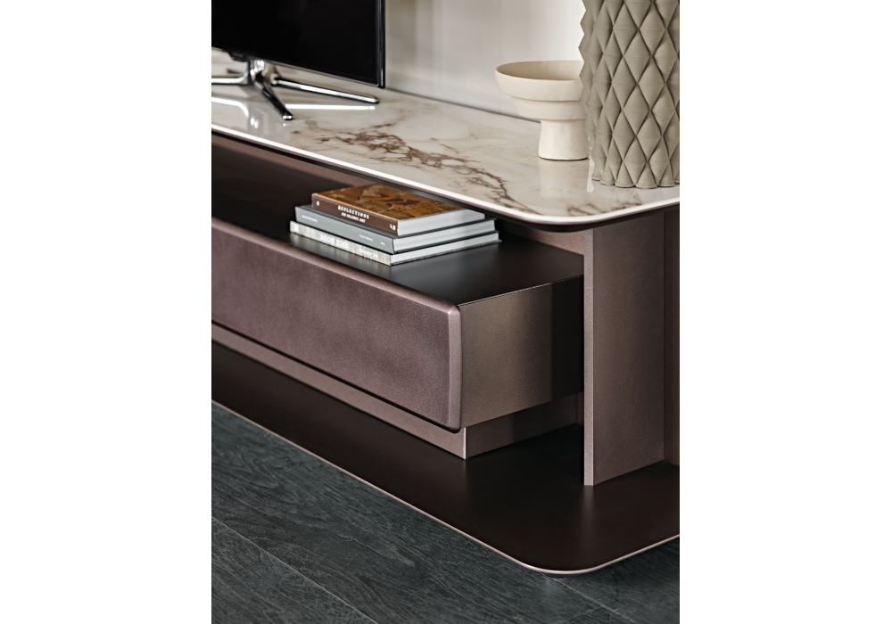 Award designed by Paolo Cattelan for Cattelan Italia is a TV cabinet with flap door. Wooden structure titanium or bronze embossed lacquered finish. Top in ceramic Marmi available indifferent colours.