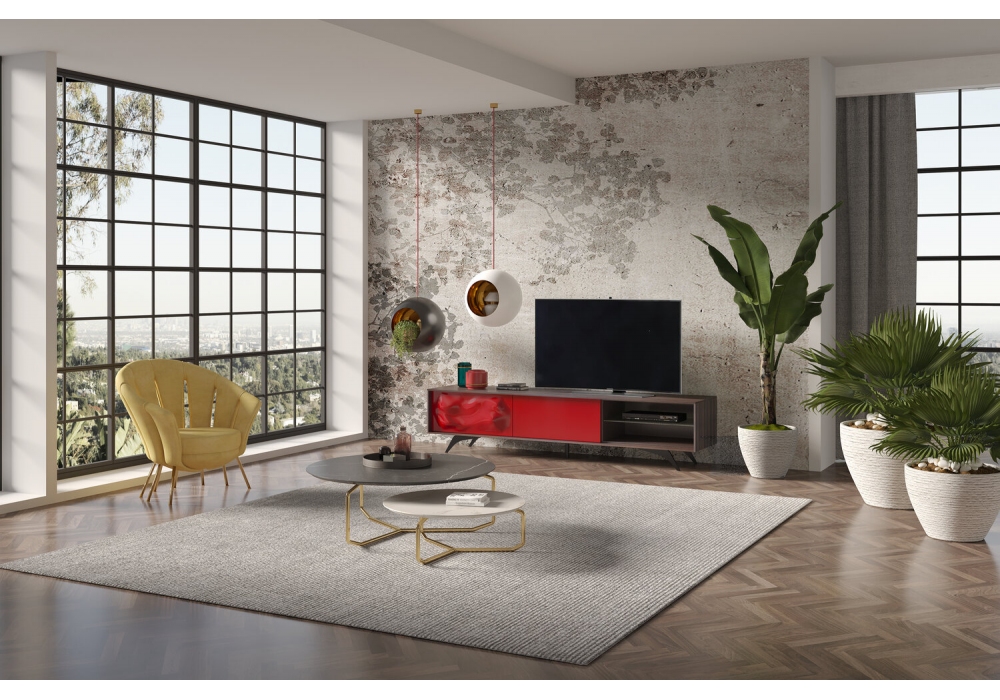 Freeman designed by Gualter Torres for Gual Design is a TV stand with veneered structure in smoked eucalyptus, doors in glossy lacquered fiberglass and feet in black painted iron. In the structure there is a drawer, a flap door and a glass filling in the open compartment.