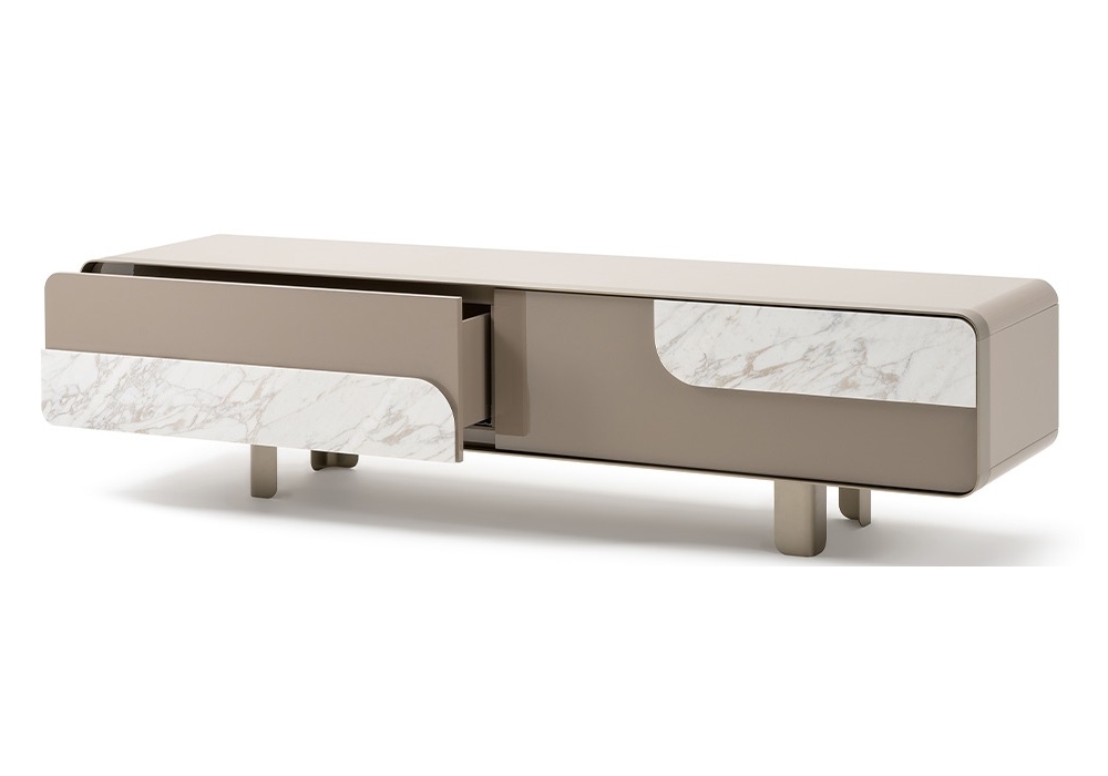 Soul designed by Giuseppe Viganò for Turri is a TV unit with MDF structure and glossy lacquered particle board panels. Metallic parts in matte finish. There are two chests of drawers with decorative details in walnut or marble.