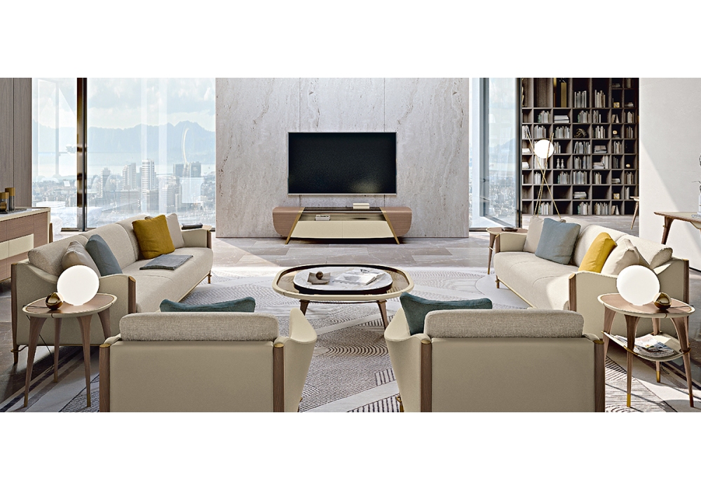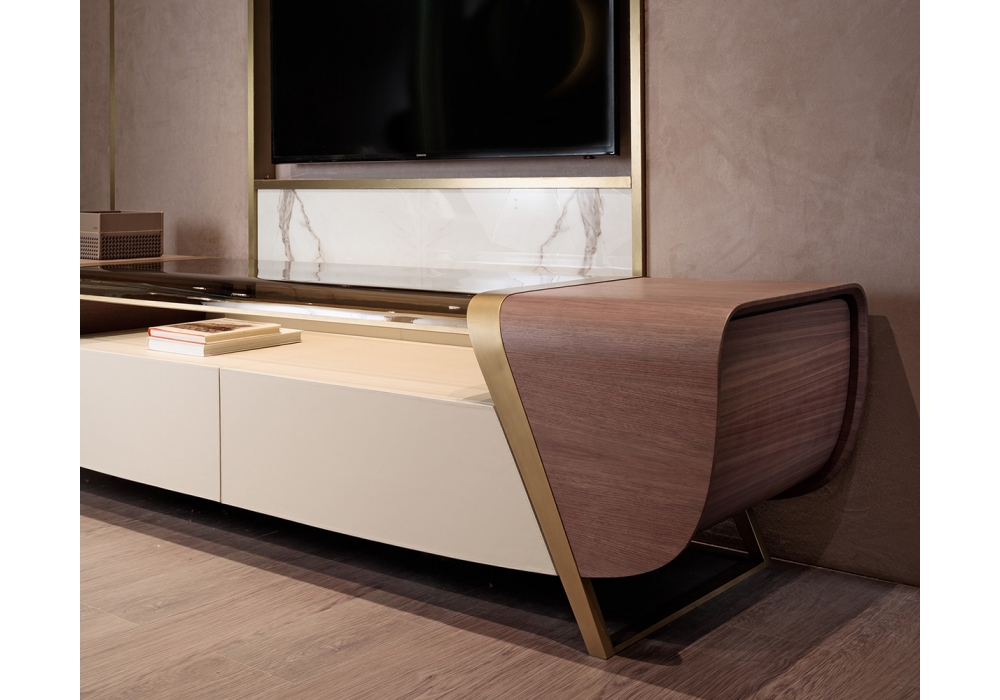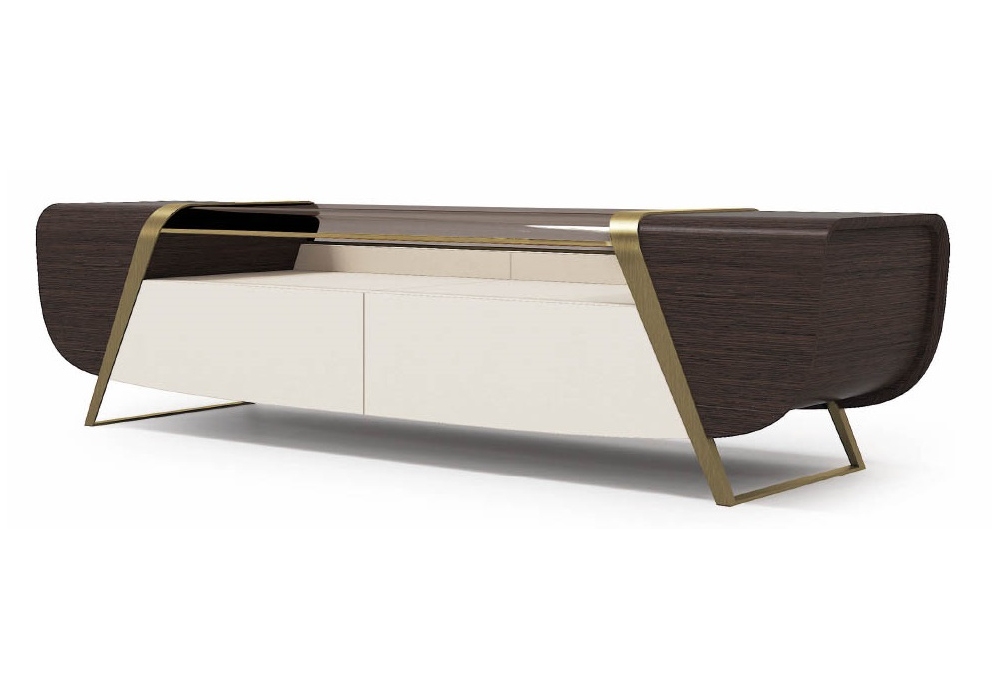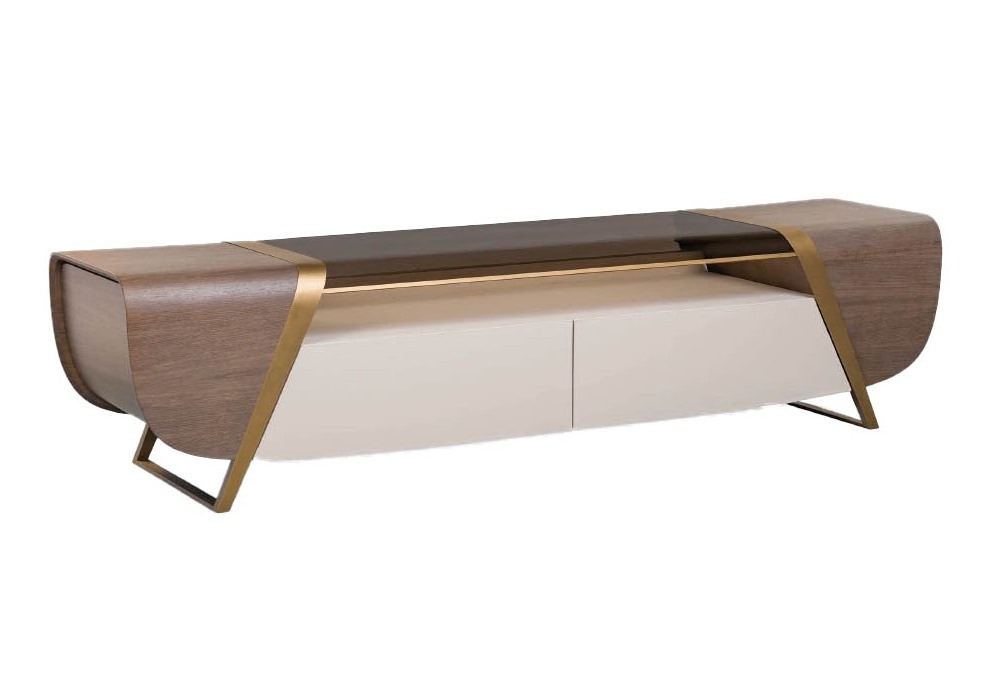 Melting Light designed by Frank Jiang for Turri is a TV stand with structure in MDF, plywood, veneered particle board panels and solid walnut wood. There is an open compartment with a bronzed glass top and base with leather applications. There are two lateral wooden flap drawers and two central sliding drawers with leather covering. Metal parts in different finishes.