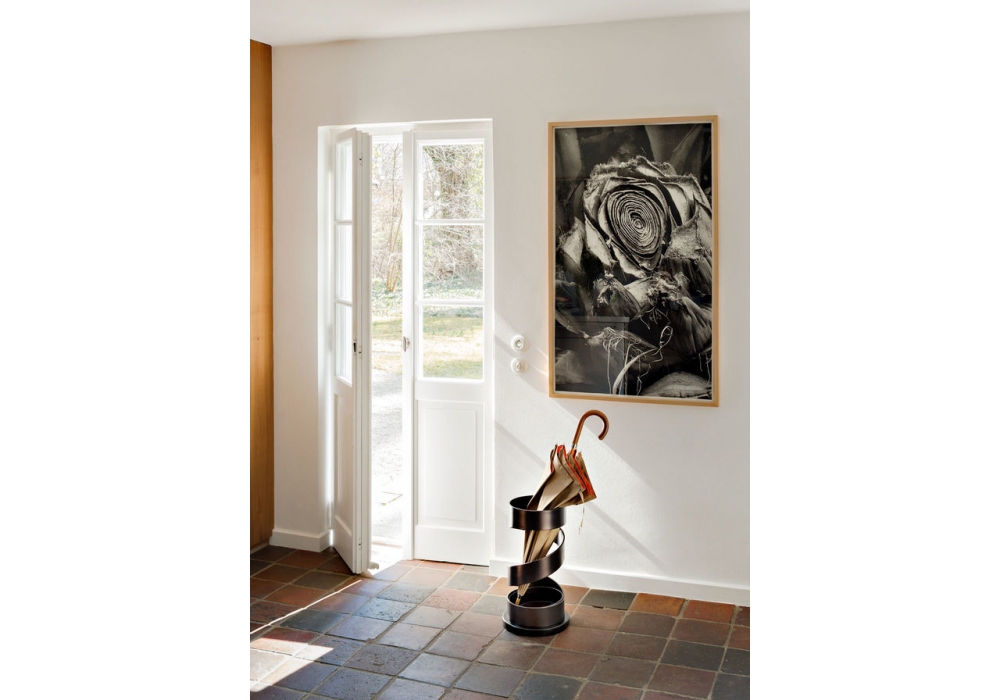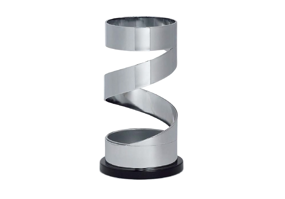 Usha designed by Eckart Muthesius for ClassiCon is a umbrella stand with chrome-plated flat steel. Base made of wood with black satin gloss lacquer finish. Drip pan sheet steel with grey lacquer finish.