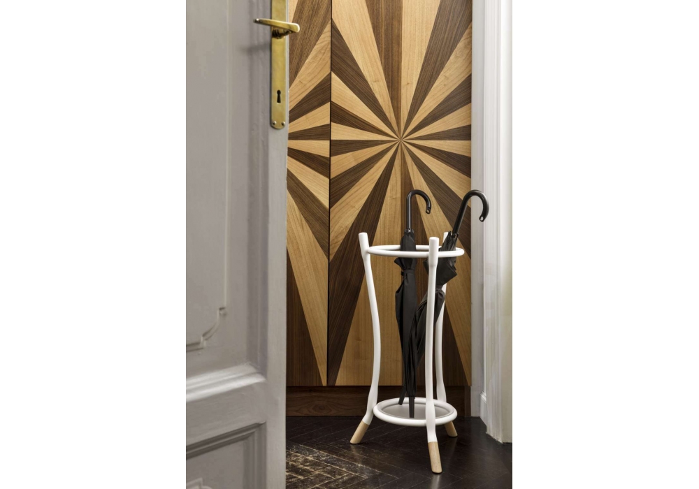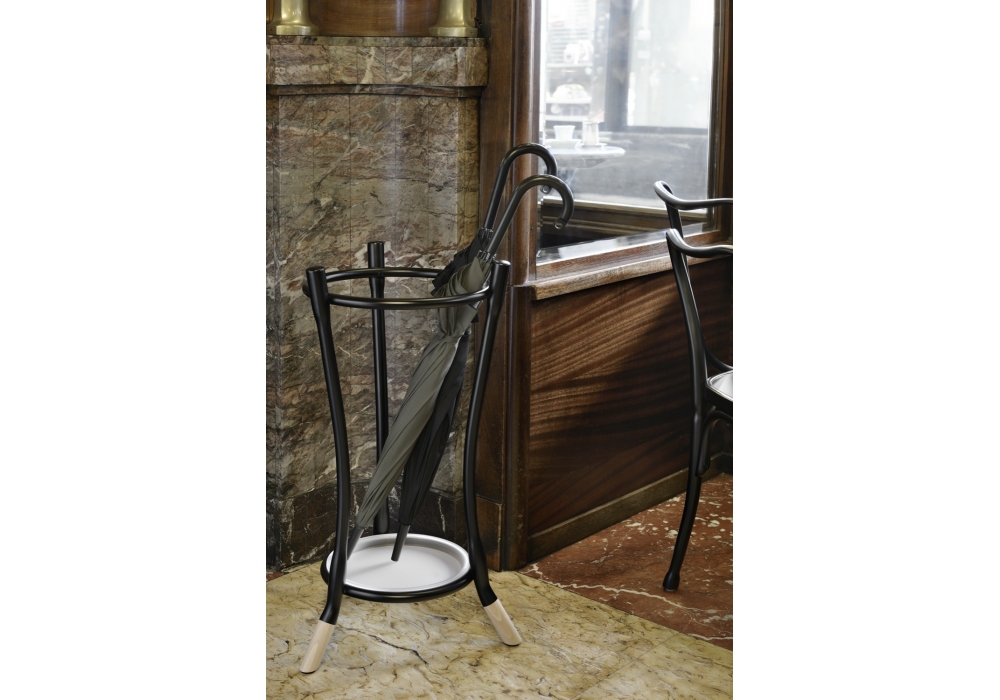 Cloud designed by Gebrüder Thonet Vienna is an umbrella stand in lacquered curved beech available in different finishes with natural beech leg and transparent neutral colour tray.