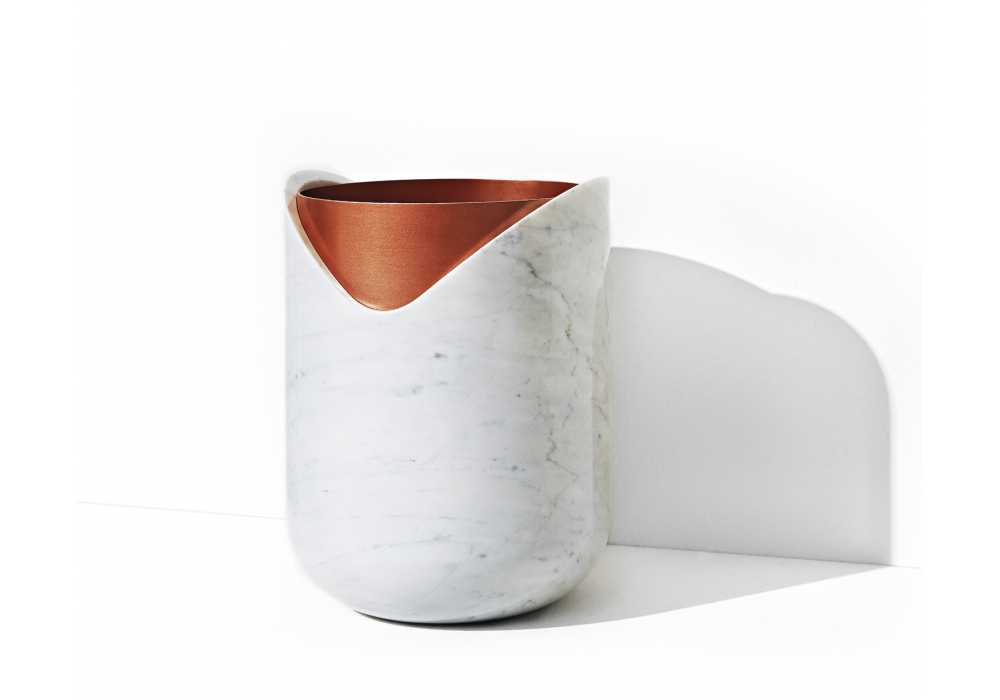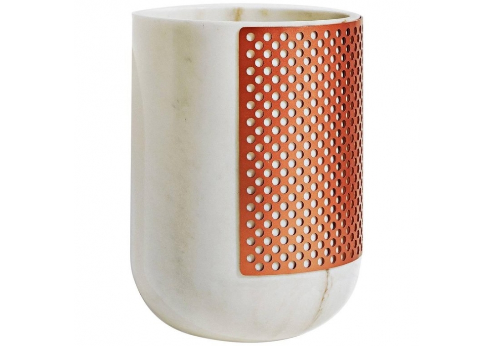 Rabbet designed by Patricia Urquiola for Budri is a vase made of marble, available in 3 finishes with a copper coloured metal grid. Available in different types.