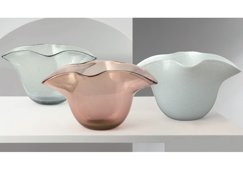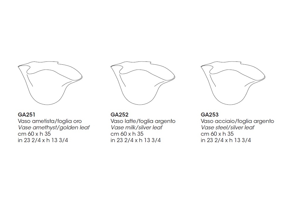 Atena designed by Giorgetti is a vase made of mould-blown glass, characterised by a traditional Venetian decoration. Available in 3 finishes: amethyst/golden leaf, satinized milk/silver leaf and steel/silver leaf.