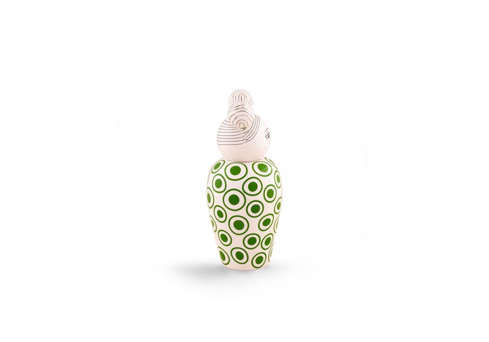 Le Canopie-Izumi designed by Elena Cutolo for Saletti is a circular-shaped vase with lid in decorated white porcelain.