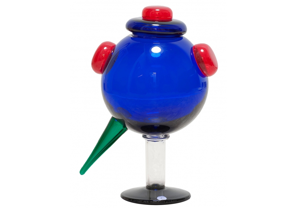 Rigel designed by Marco Zanini for Memphis Milano is a vase with lid, made of transparent, blue, black, green, red glass.