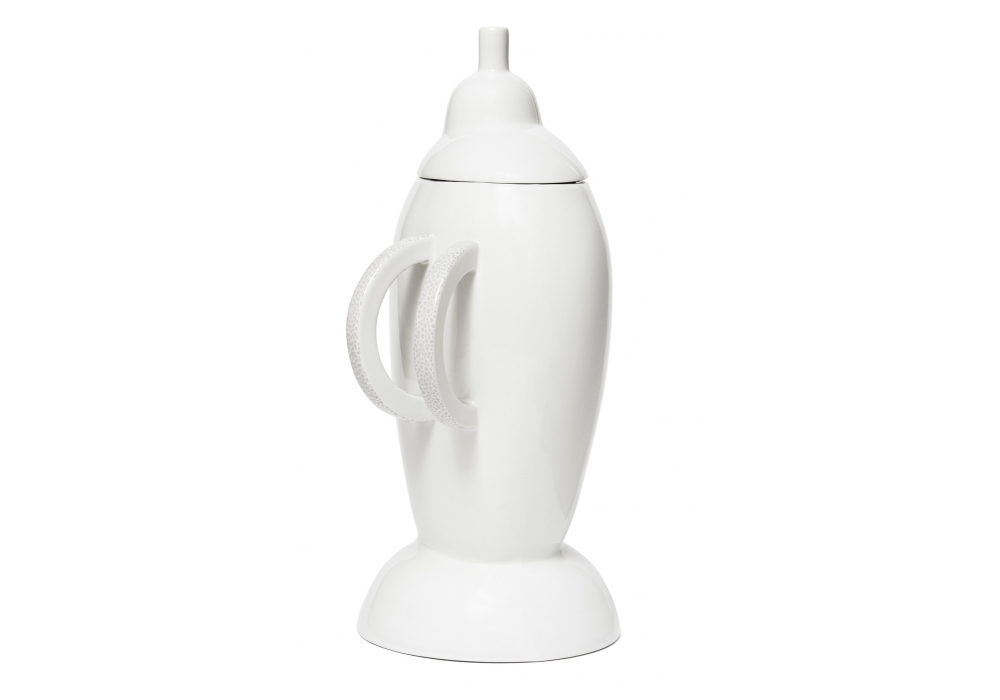 Garda designed by Matteo Thun for Memphis Milano is a vase made of white porcelain with decorations and three handles.
