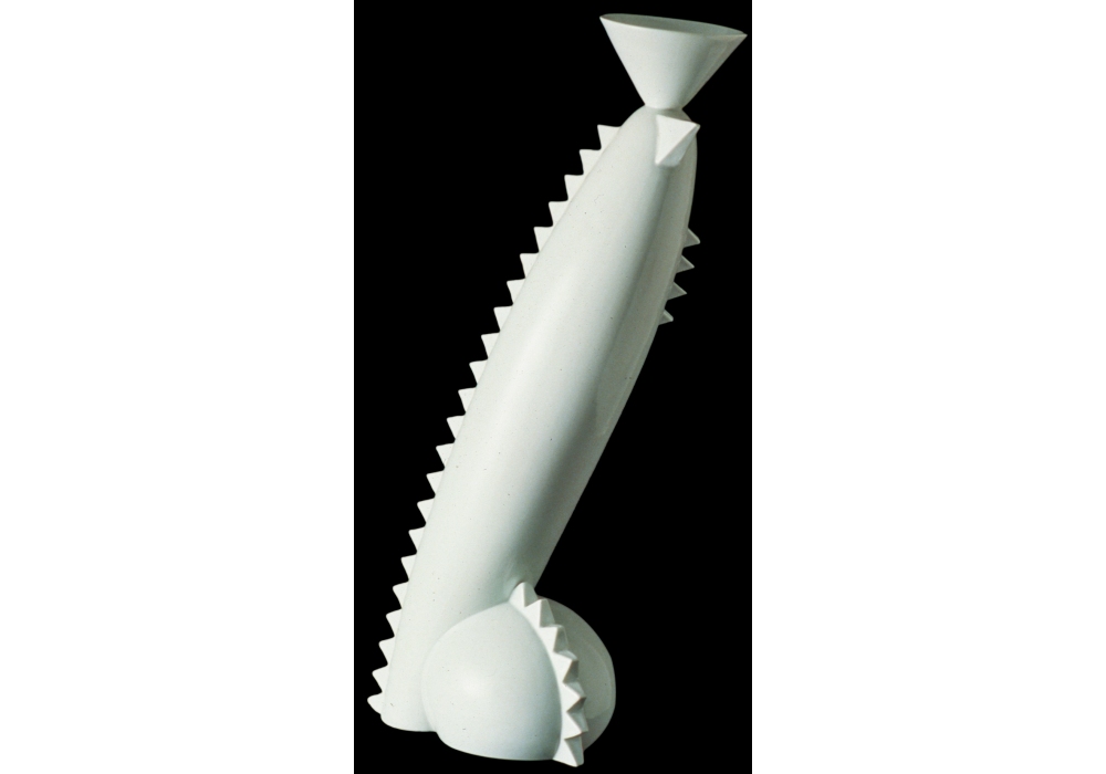 Volga designed by Matteo Thun for Memphis Milano is a vase made of white porcelain with decorations.