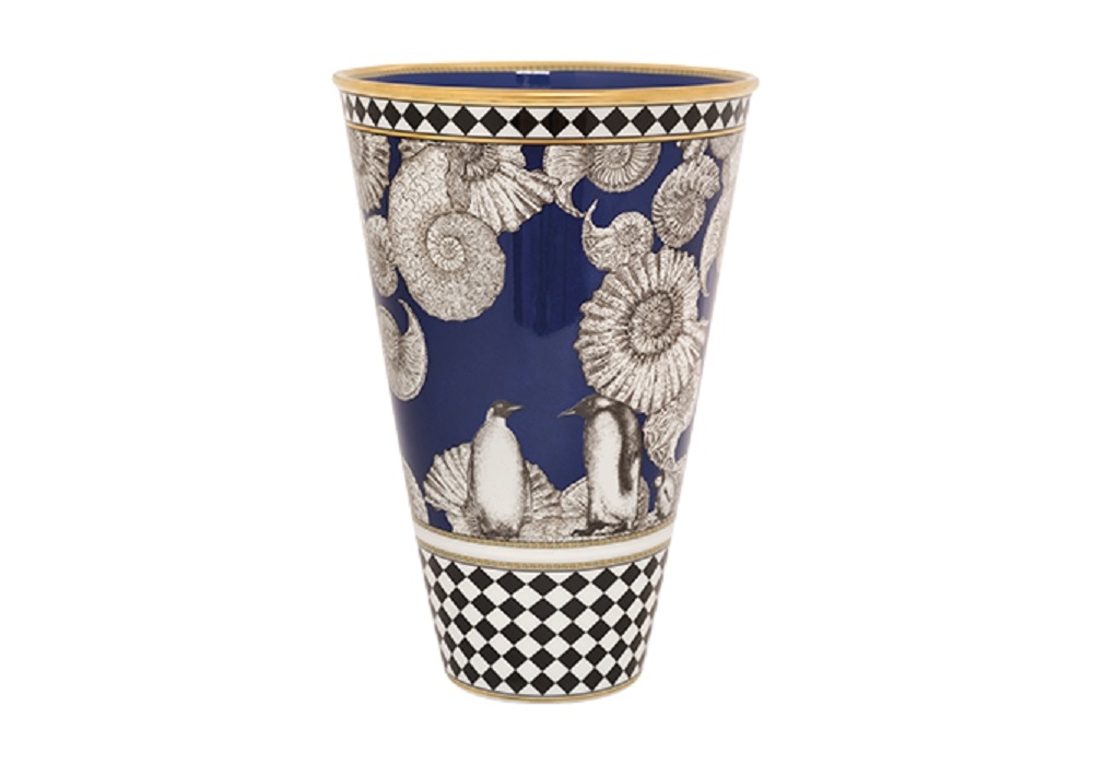 Totem Pinguino designed by Ginori 1735 is a decorated truncated cone shaped vase. Penguin, symbol of love and fidelity.