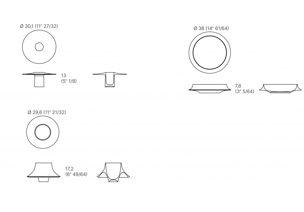 | Dimensions | - Ø 30.1 x H 13 cm; - Ø 29.6 x H 17.2 cm; - Ø 38 x H 7.8 cm. |