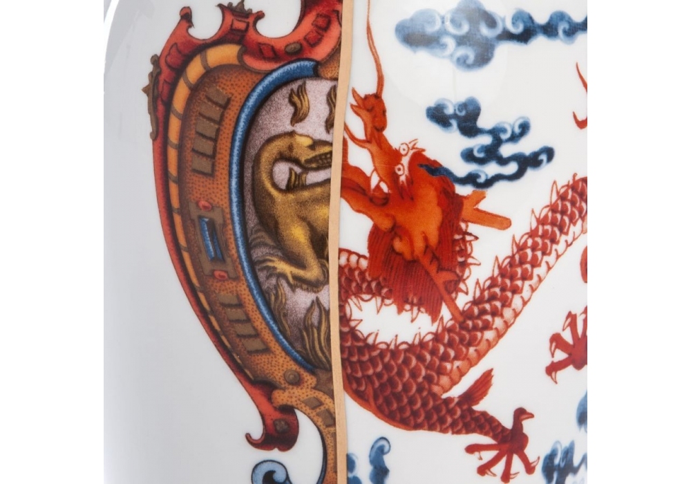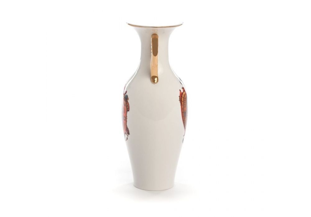 Hybrid Adelma designed by CTRLZAK for Seletti is a white and gold porcelain vase created by combining two opposing shapes. The surface is decorated with various figures and pigments.