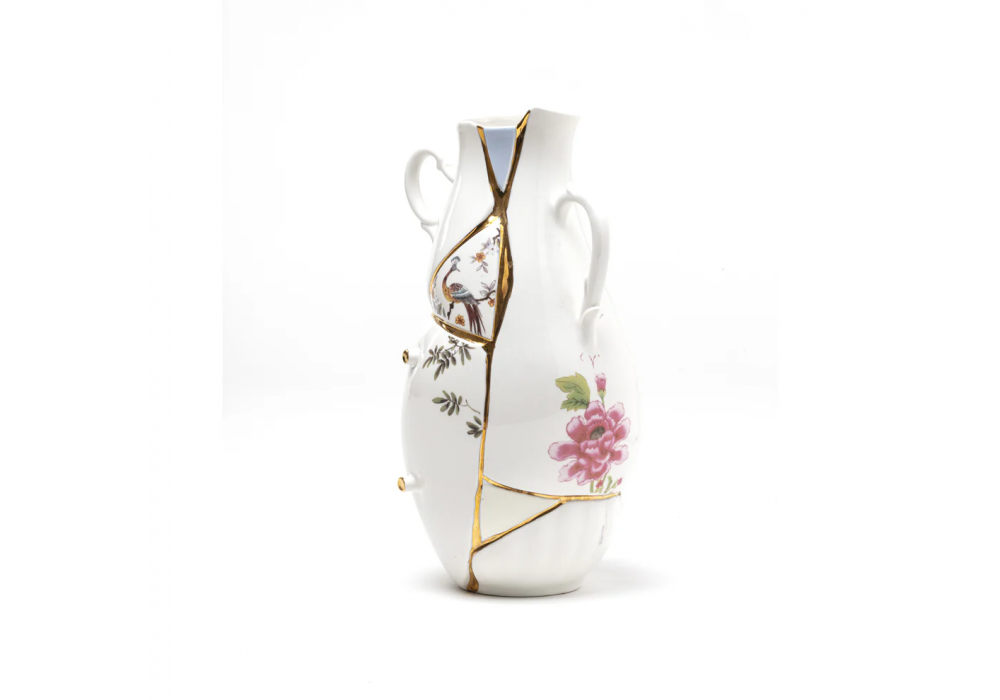 Kintsugi designed by Marcantonio for Seletti is a white porcelain vase with gold details decorated with floral motifs. Kintsugi is available in different models.