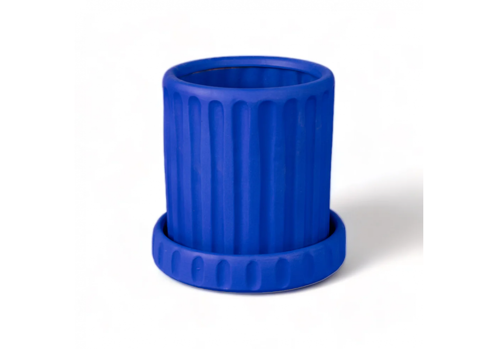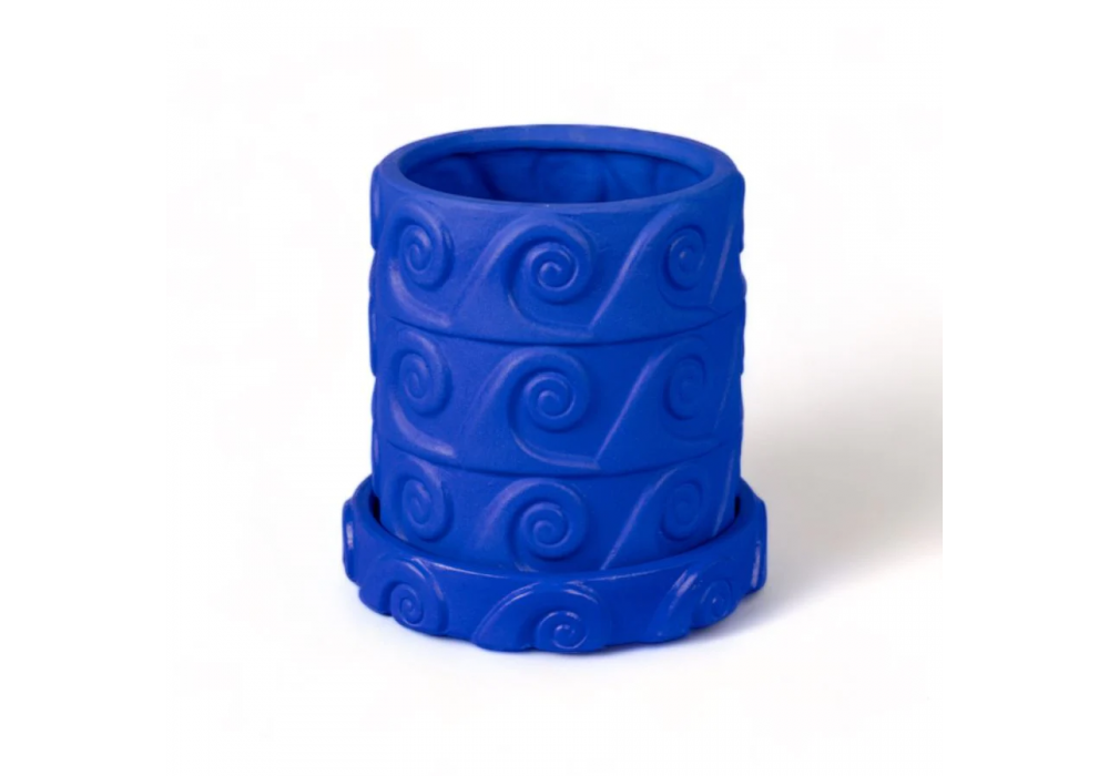 Magna Graecia Blu designed by Antonio Aricò for Seletti is a blue painted terracotta vase with a cylindrical shape with a surface enriched by multiple geometric figures. Magna Graecia Blu is available in different models.