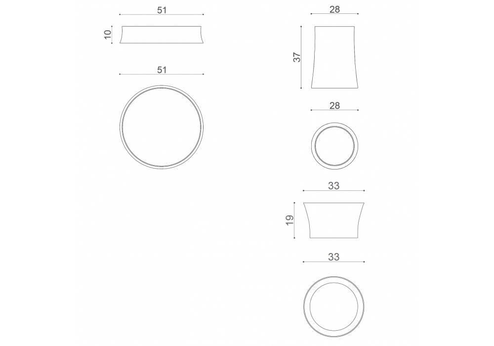 | Dimensions | Ø 51 x H 10 cm; Ø 28 x H 37 cm; Ø 33 x H 19 cm. |