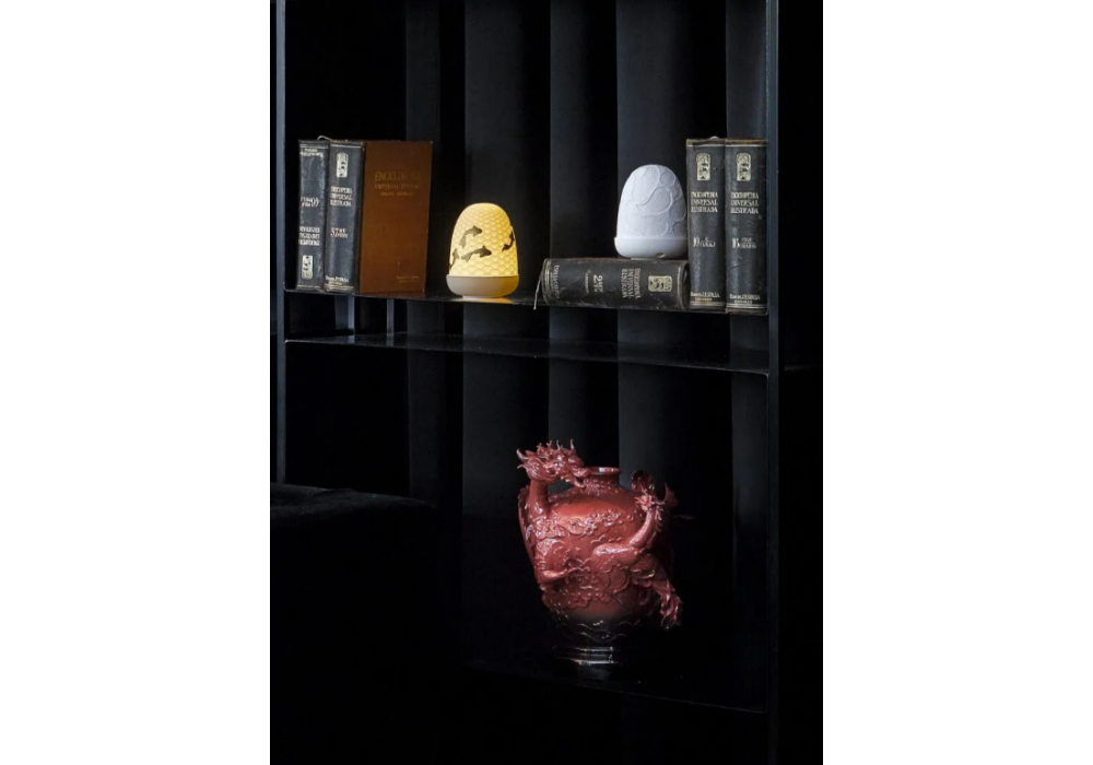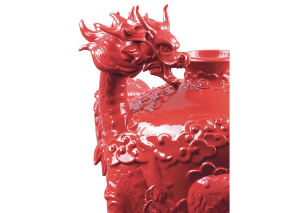 Dragon and Phoenix signed by Dept. Diseño y Decoración for Lladró is a vase in glossy red porcelain on a black base with a dragon and phoenix. The plumage of the bird and the skin of the dragon are in relief.