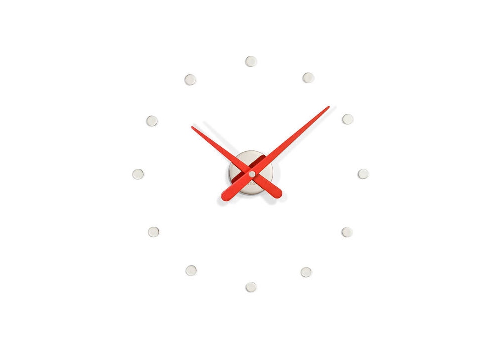 Rodòn Mini L designed and produced by Nomon is a wall clock with 12 time signals and central box in chromed brass, hands in walnut varnished in different finishes.