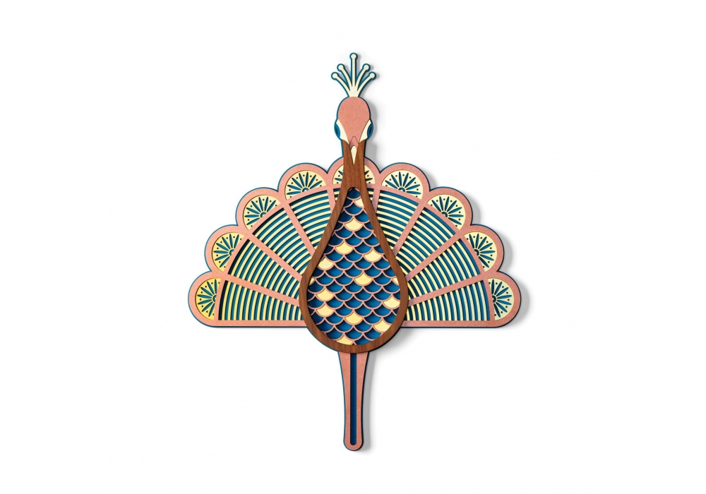 The Peacock designed by Tzachi Nevo for Umasqu is an handmade wooden wall decoration made from a combination of different materials such as Veneer, MDF, Formica, Perspex, Plastic, and Felt and are all colored with quality Molotow™ Premium colors.