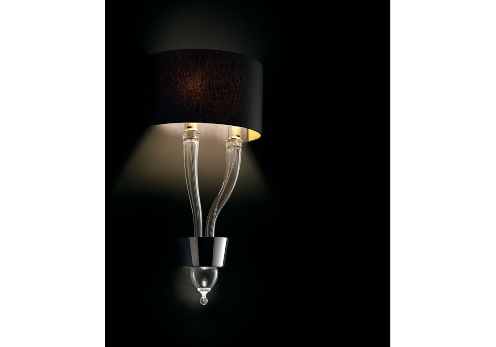 Pandora designed and produced by Barovier & Toso is a wall lamp with a metal supporting structure covered in Venetian glass. The lampshade is in fabric and shields dimmable LED or halogen light sources. Pandora is available in different finishes.