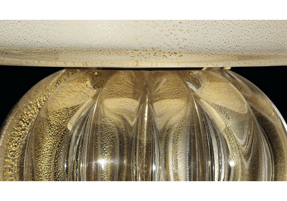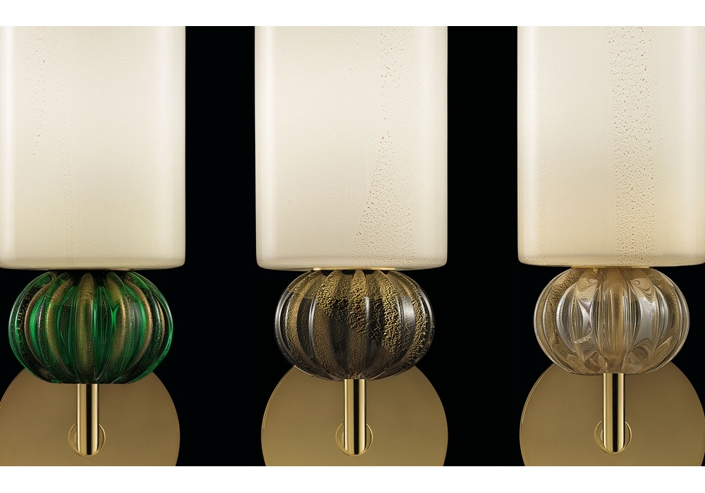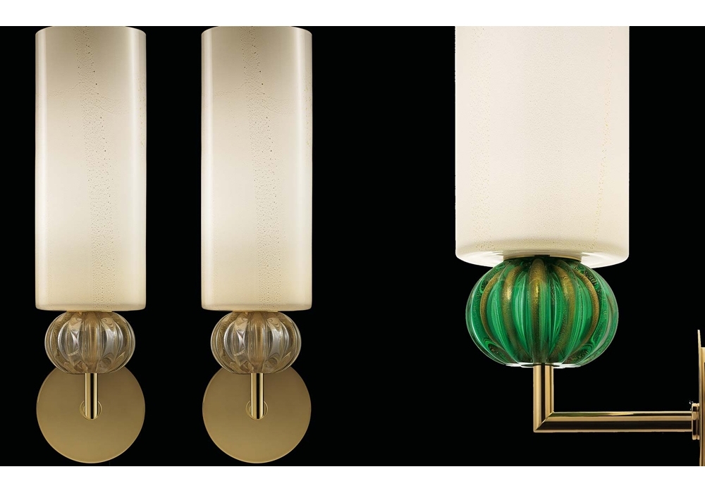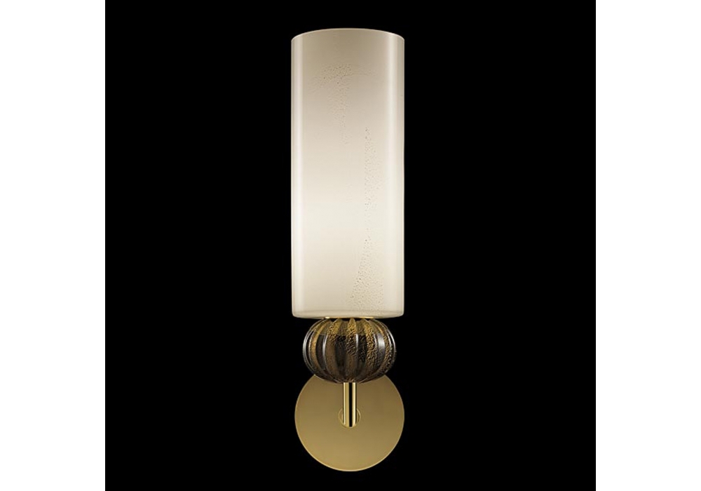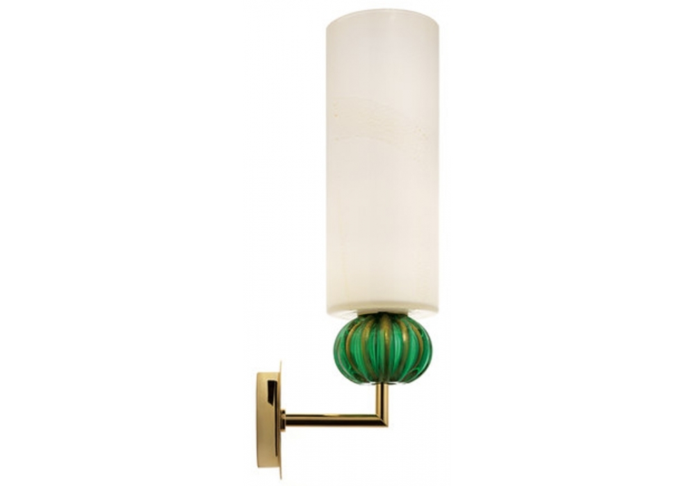 Gallia designed and produced by Barovier & Toso is a wall lamp with a metal supporting structure with Venetian glass ornaments. The diffuser is cylindrical in white Venetian glass and shields a dimmable LED or halogen light source. Gallia is available in different finishes.