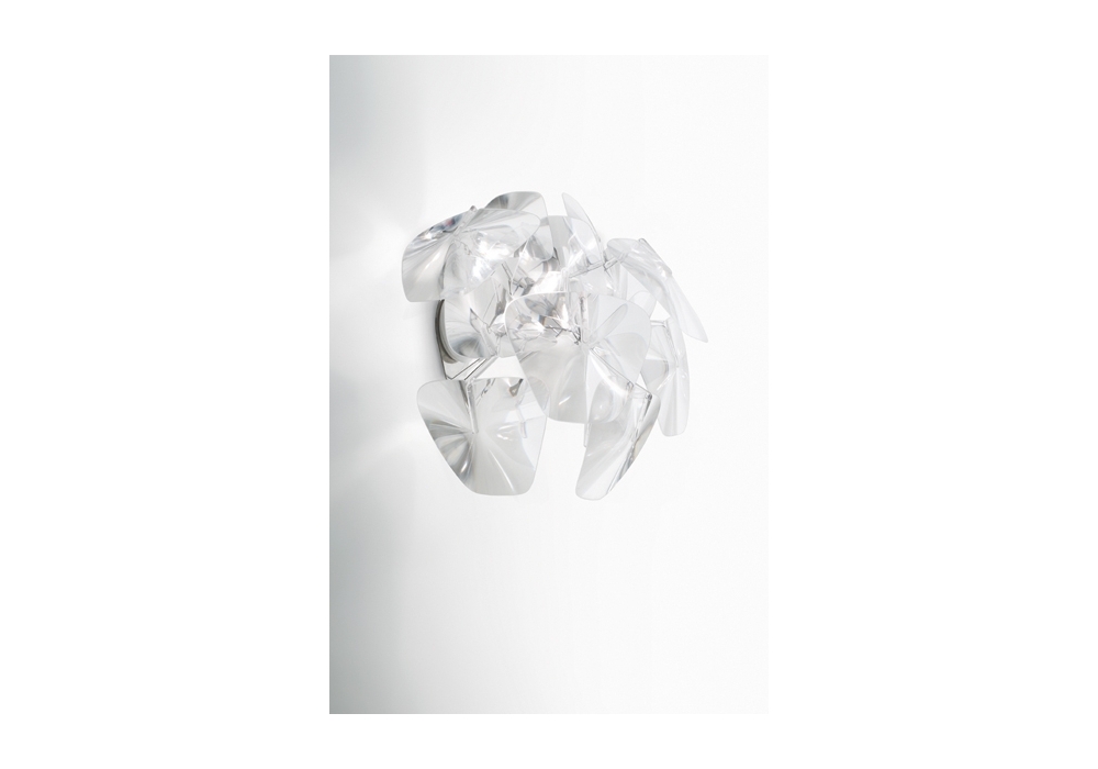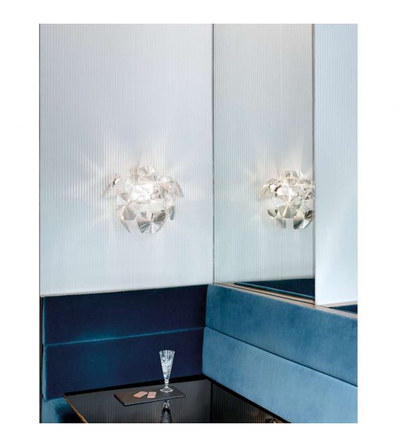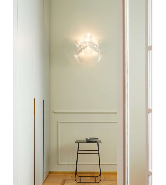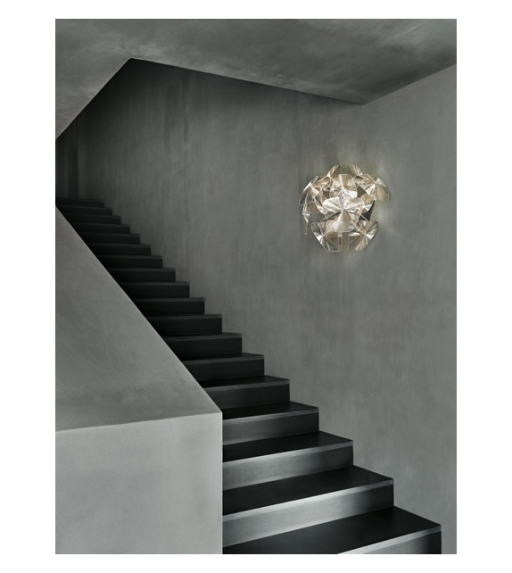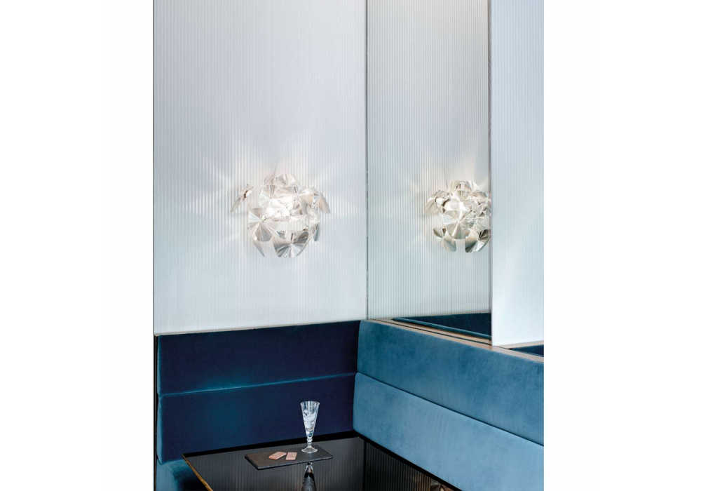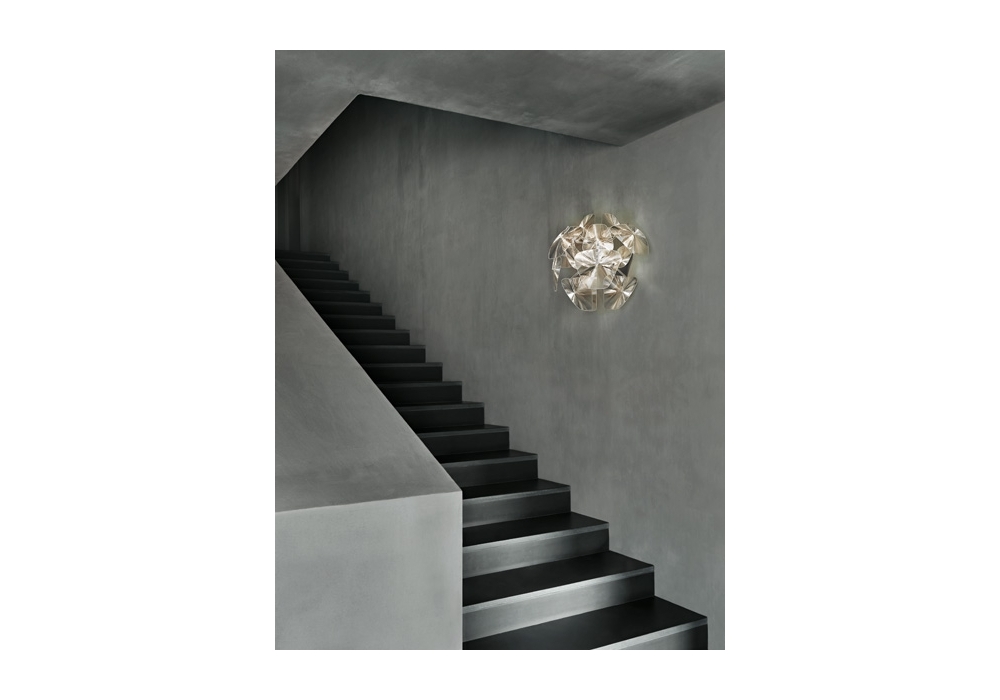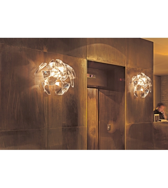Hope designed by Francisco Gomez Paz and Paolo Rizzatt for Luceplan is a wall lamp with structure in polished steel and transparent polycarbonate. Prismatic lenses in methacrylate. Suitable for any type of light source. Available in two sizes.