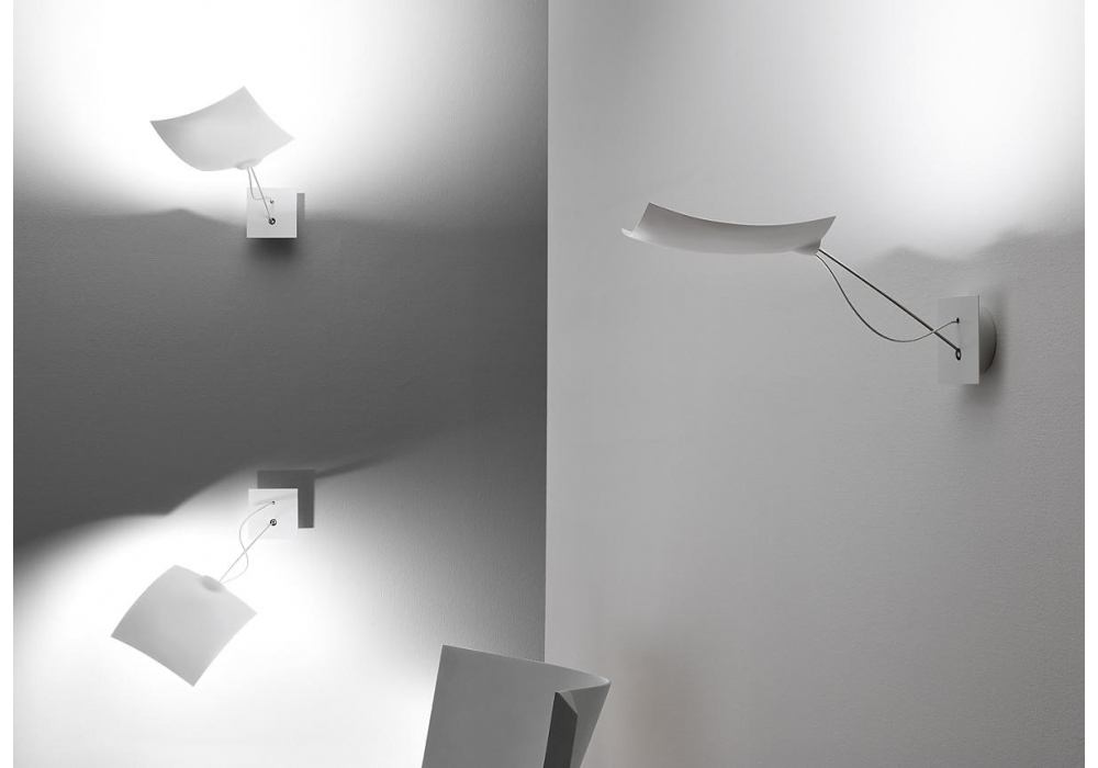 18 x 18 designed and produced by Ingo Maurer is a wall lamp with powder coated aluminum shade, structure in stainless steel and synthetic material. Two ball joints allow for particularly flexible adjustment.