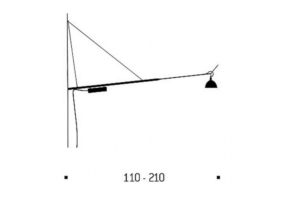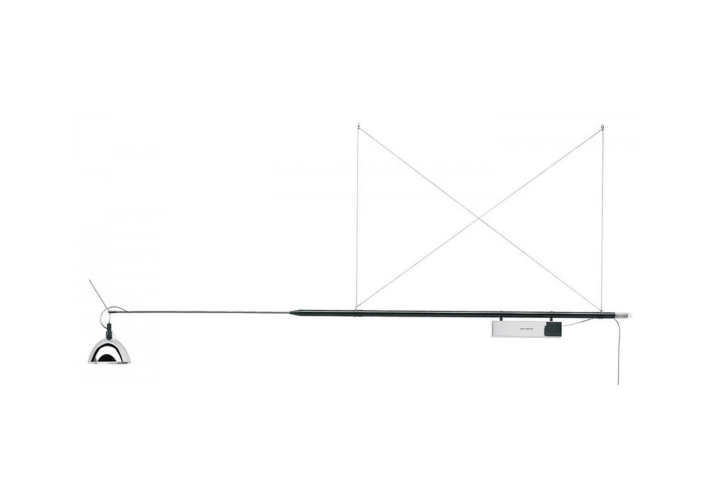 Max. Mover is a wall lamp designed by Ingo Maurer. Aluminium, fibreglass. The name means what it says – the telescope arm extends from 110 to 210 cm, the nylon suspension wires allow for height adjustment and the lamp can be rotated through 180°. The reflector is freely adjustable in two directions, using the handle.