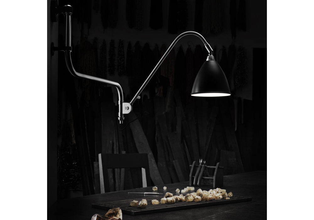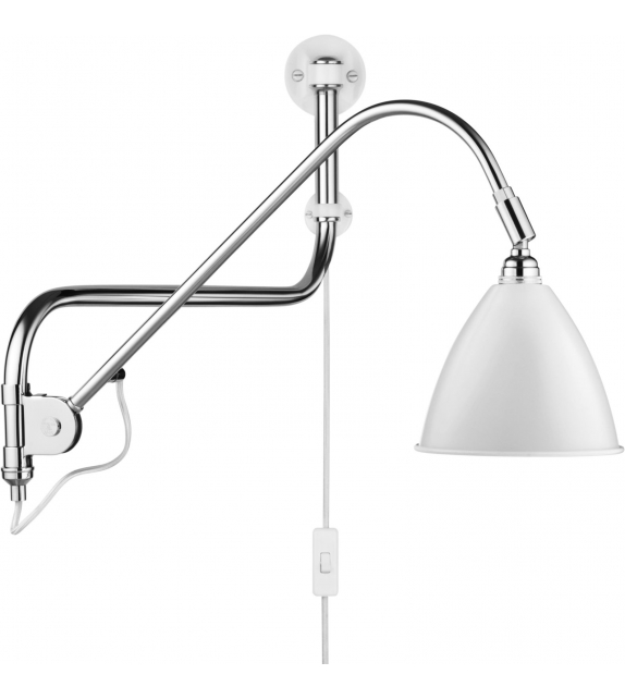 Bestlite BL10 designed by Robert Dudley Best for Gubi is a wall lamp with lampshade in powder-coated metal, chromed arm and fabric cable. The arm of the lamp is extendable and can be tilted 90 degrees from horizontal to vertical and the shade can be rotated 360 degrees. The textile cord matches the shade. Available in two finishes.