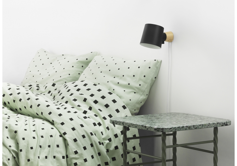 Rise designed by Marianne Andersen for Normann Copenhagen is a wall lamp with base in oak and diffuser in powder coated steel. The base and the cylindrical diffuser of Rise are joined by a pin that makes it possible to rotate the screen around the base and adjust the direction of the light and also allows both direct and indirect lighting. Rise is available in EU (European) or US (U.S.A) version, and model with wall socket or direct plug to electrical system.