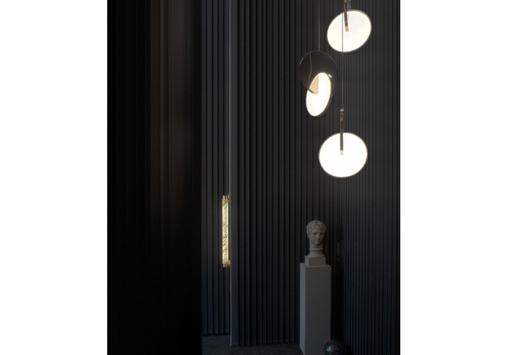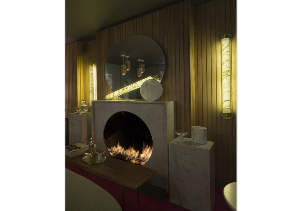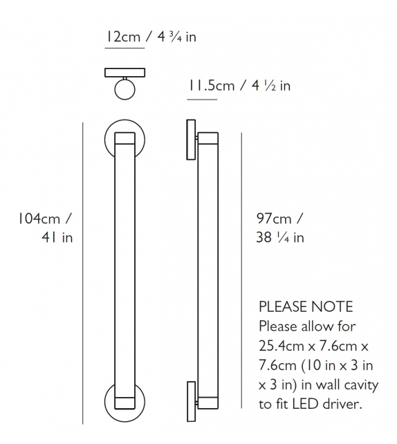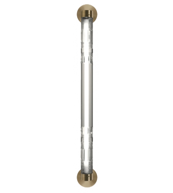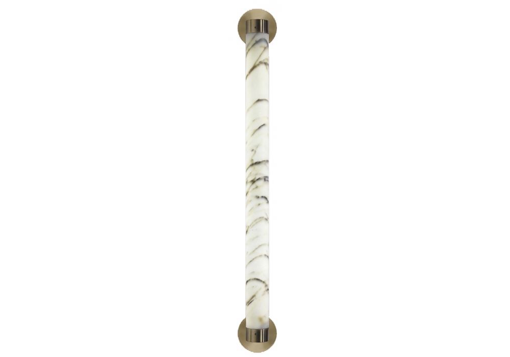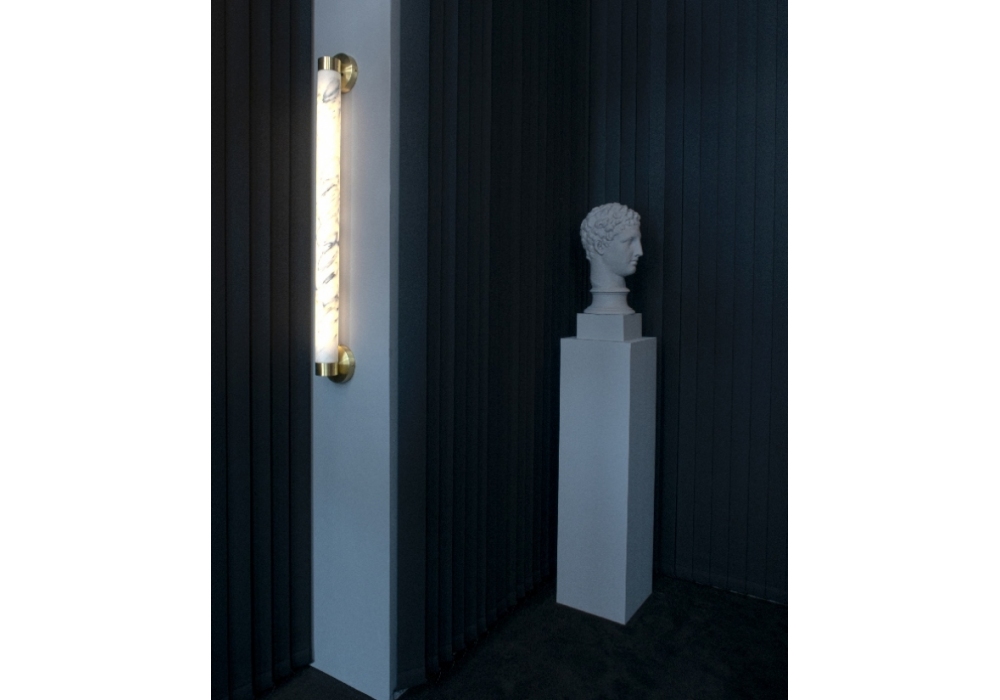 Tube designed by Lee Broom is a wall lamp composed of a single piece of Carrara marble and the two ends with bands of brushed brass or polished chrome. Contains a strip of LED bulbs that stand out in what appears to be a solid, warm, glowing stone.