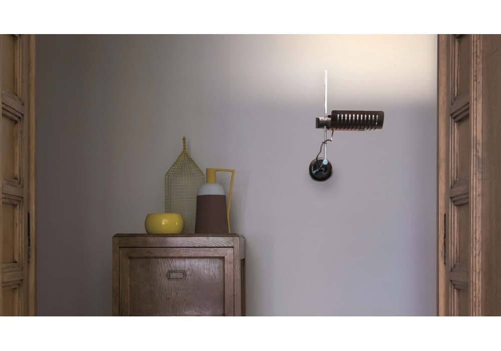 Colombo designed by Joe Colombo for Oluce is a wall lamp with steel support and vertical stem in chromed metal. The diffuser is adjustable in painted aluminum and shields a LED light source. Colombo is available in different finishes.