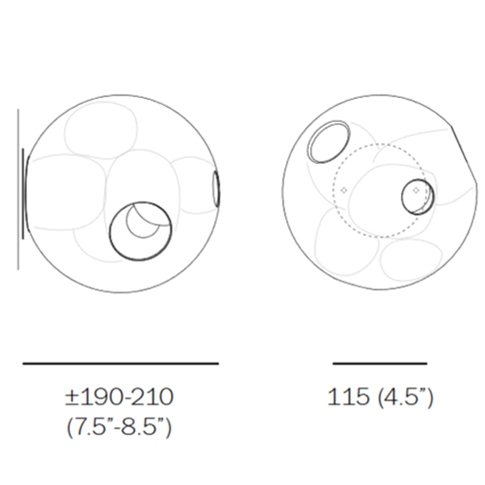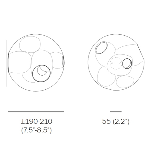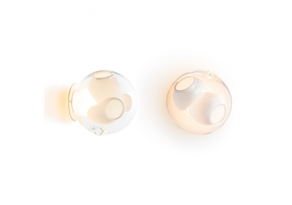 38 designed by Omer Arbel for Bocci is a wall lamp with handmade glass diffuser and LED or Xenon light source. The structural support is made of metal. 38 is available in two different versions 38s and 38 sp. the 38s does not connect directly to the mains, but via a power supply; while the 38sp has an integrated power supply and can be connected directly to the mains.