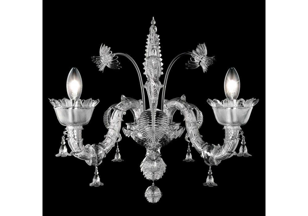 4607 designed and produced by Barovier & Toso is a wall lamp with metal supporting structure with polished chrome decorations. The entire structure is covered in Venetian glass available in different finishes with crystal details. The light source used is of the dimmable LED or halogen type.