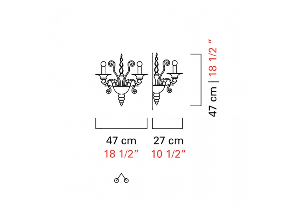 Dhamar designed and produced by Barovier & Toso is a wall lamp with supporting structure and metal decorations in galvanized gold or polished chrome finishes. The arms and the lamp body are covered in Venetian glass with crystal pendants. The light sources adopted are of the dimmable LED or halogen type.