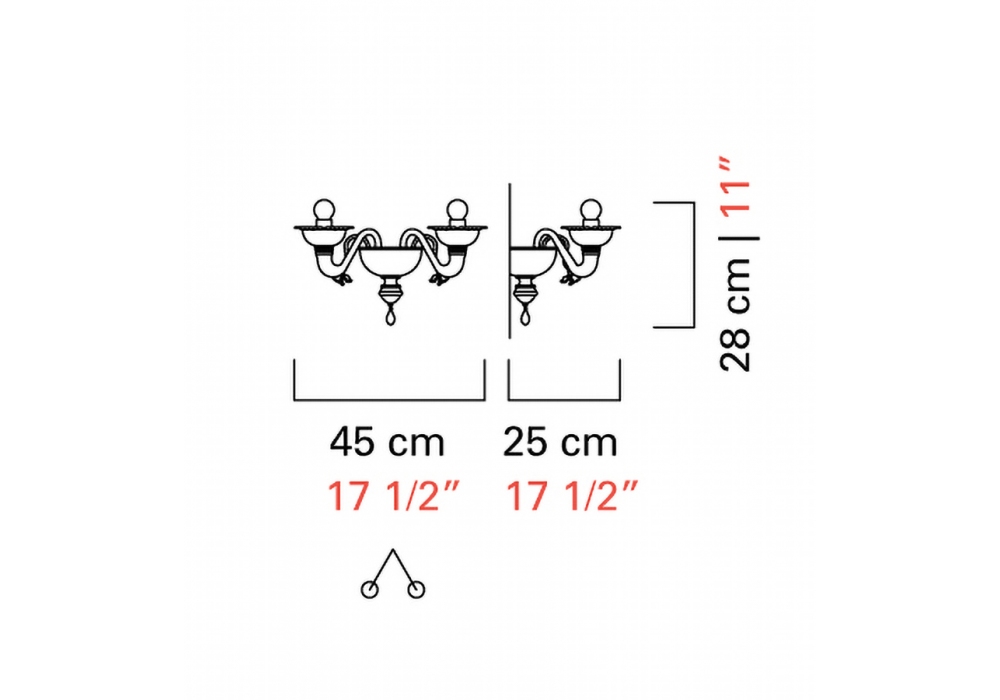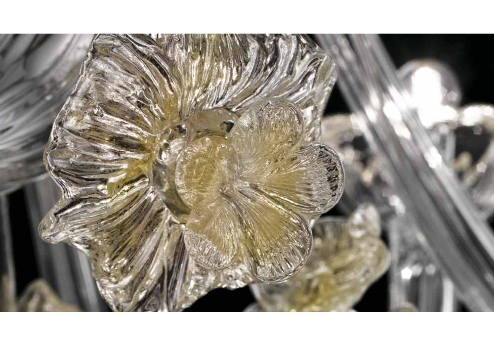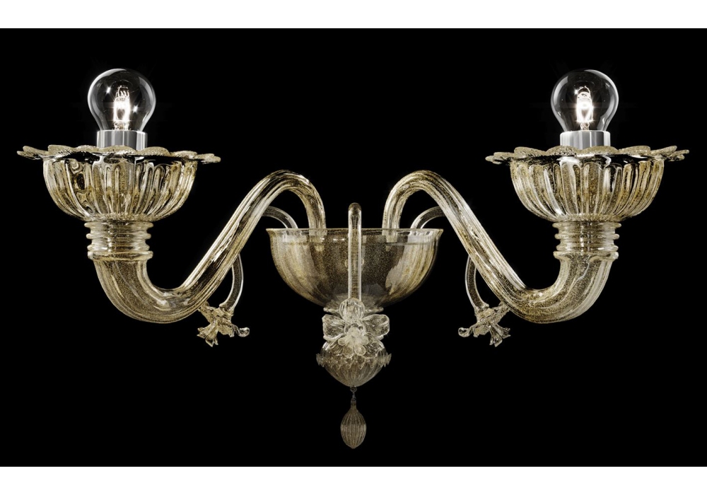 Nekhel designed by Barovier & Toso is a wall lamp with supporting structure and decorations in galvanized gold-colored metal or polished chrome. The lamp body and the arms are entirely covered in Venetian glass embellished with crystal pendants. The light source used is of the dimmable LED or halogen type. Nekhel is available in different finishes.