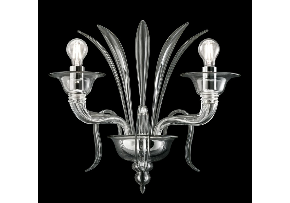 Odile designed and produced by Barovier & Toso is a wall lamp, with supporting structure and decorations in polished chrome or galvanized gold colored metal. The arms and the lamp body are entirely covered in Venetian glass with lamp holders wrapped in crystal glasses with a dimmable LED or halogen light source adopted. Odile and available in different finishes.