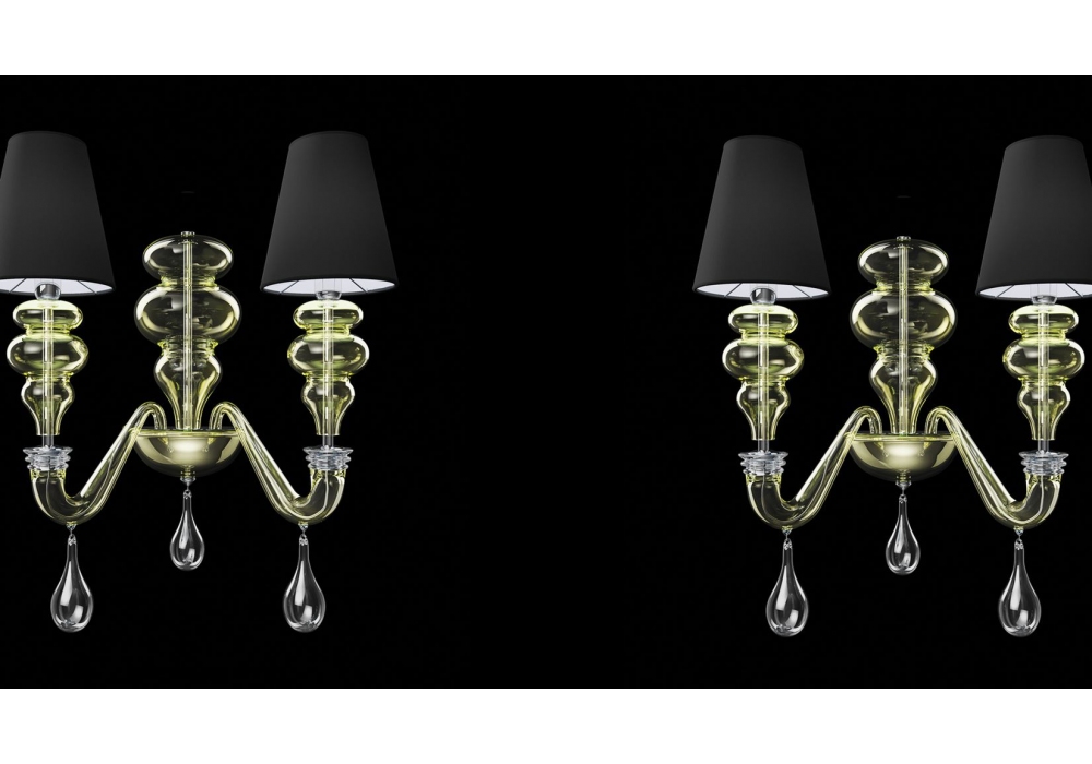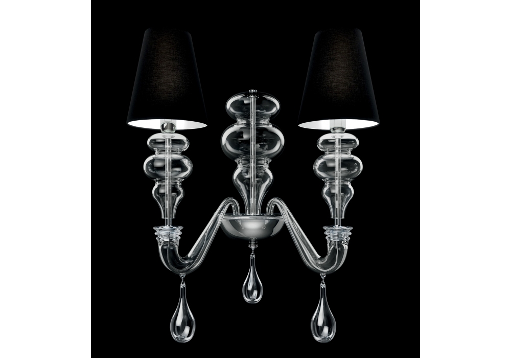 Ran Round designed and produced by Barovier & Toso is a wall lamp with supporting structure and metal details in galvanized gold or polished chrome finishes. The lamp body and the arms are covered in Venetian glass with circular fabric lampshades. The light sources adopted are of the dimmable LED or halogen type. Ran Round is available in different finishes.