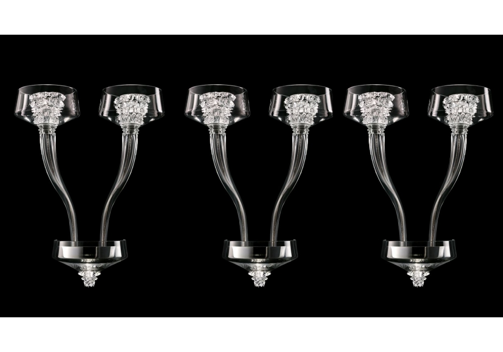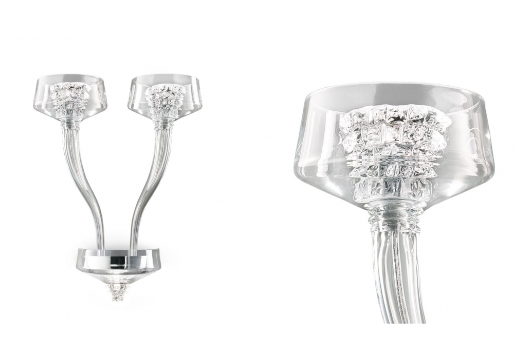 Rosati designed and produced by Barovier & Toso is a wall lamp with supporting structure and details in galvanized gold-colored metal or polished chrome. The lamp body is covered in Venetian glass with crystal decorations and adopts dimmable LED light sources. Rosati is available in different finishes.