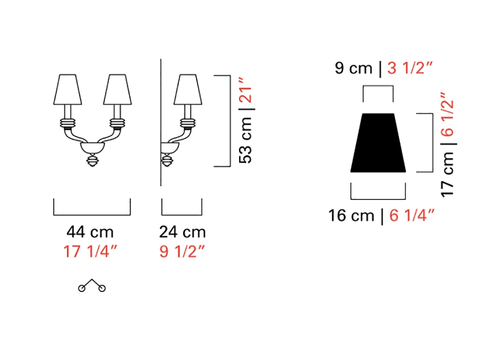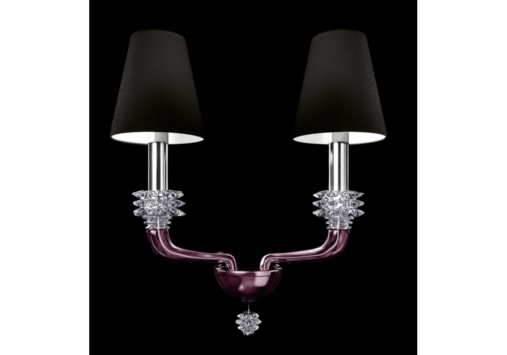 Rotterdam designed and produced by Barovier & Toso is a wall lamp, with metal supporting structure, and visible parts in polished chrome or galvanized gold finishes. The lamp body is entirely covered in Venetian glass available in different colors. The light sources are dimmable incandescent (not included), shielded by two fabric lampshades available in the following colors: black, white or black with gold interior.