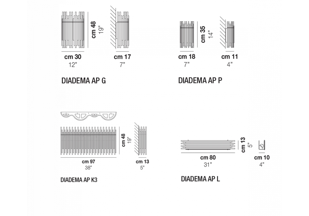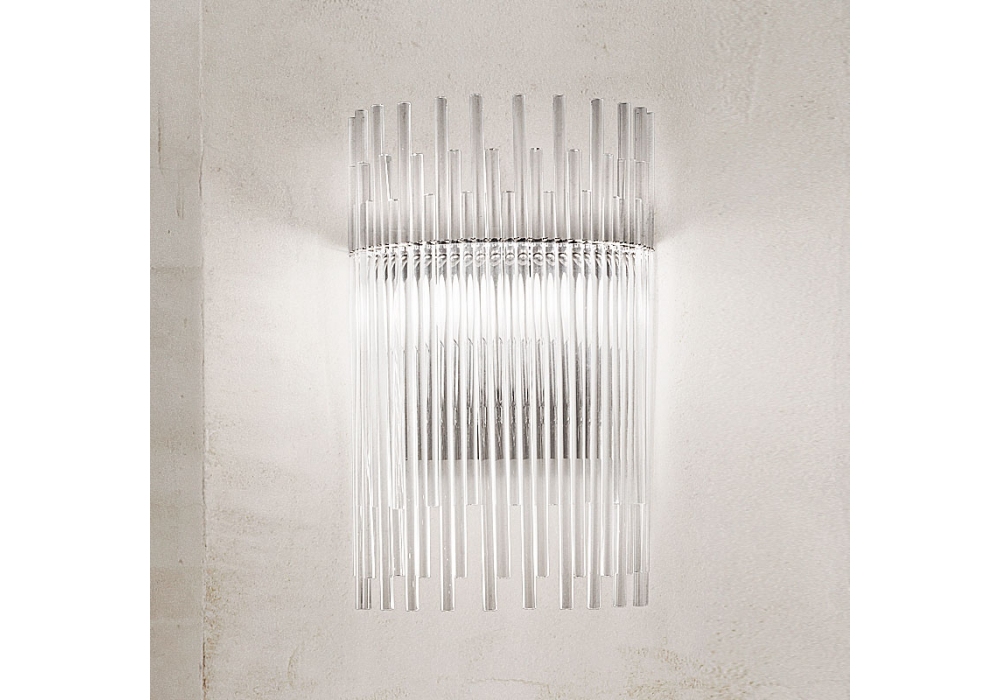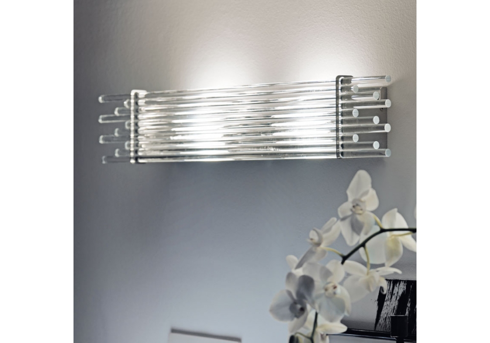 Diadema designed by Romani Saccani Architetti Associati for Vistosi is a wall lamp with supporting structure in painted metal. The diffuser is structured by a series of tubular crystal elements placed side by side and shield a light source with E27/G9/R7S connection of the LED or dimmable halogen type. Diadema is available in different models.