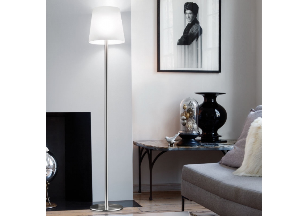 Naxos designed and produced by Vistosi is a floor lamp with circular base and vertical rod in nickel-colored metal. The circular diffuser is in satin white glass and adopts a LED or halogen light source with E27 fitting.
