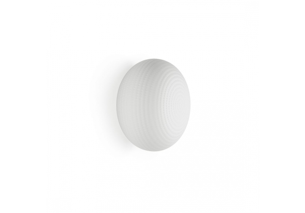 Bianca designed by Matti Klenell for Fontana Arte is a wall/ceiling lamp with a circular base in painted metal. The diffuser has an ellipsoidal shape with an irregular surface in white coated glass, and adopts a LED light source. Available in different dimensions.