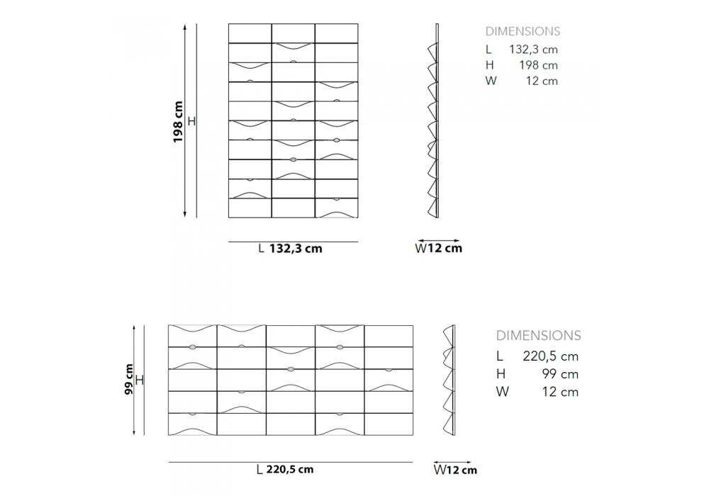 | Dimensions | L 44,1 x W 2 x H 19,8 cm; L 44,1 x W 12 x H 19,8 cm; L 132,3 x W 12 x H 198 cm; L 220,5 x W 12 x H 99 cm. |