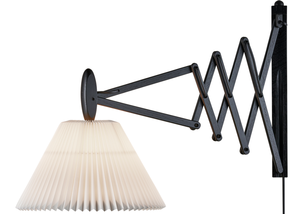 Sax 233, designed by Erik Hansen & Harrit SØrensen+Samson for Le Klint is a wall lamp, composed of the combination of metal, wood, plastic and paper material. Structured with a pantograph system, it allows to have a very versatile lamp, giving depth and at the same time reduced and compact dimensions. The lampshade is circular in shape, and enriched by a surface with regular and precise folds to ensure optimal light diffusion. The light source used is LED or halogen (not included), powered by a cable covered in white plastic. Sax 233 is available in different wood finishes, and with lampshade in plastic and refined paper.