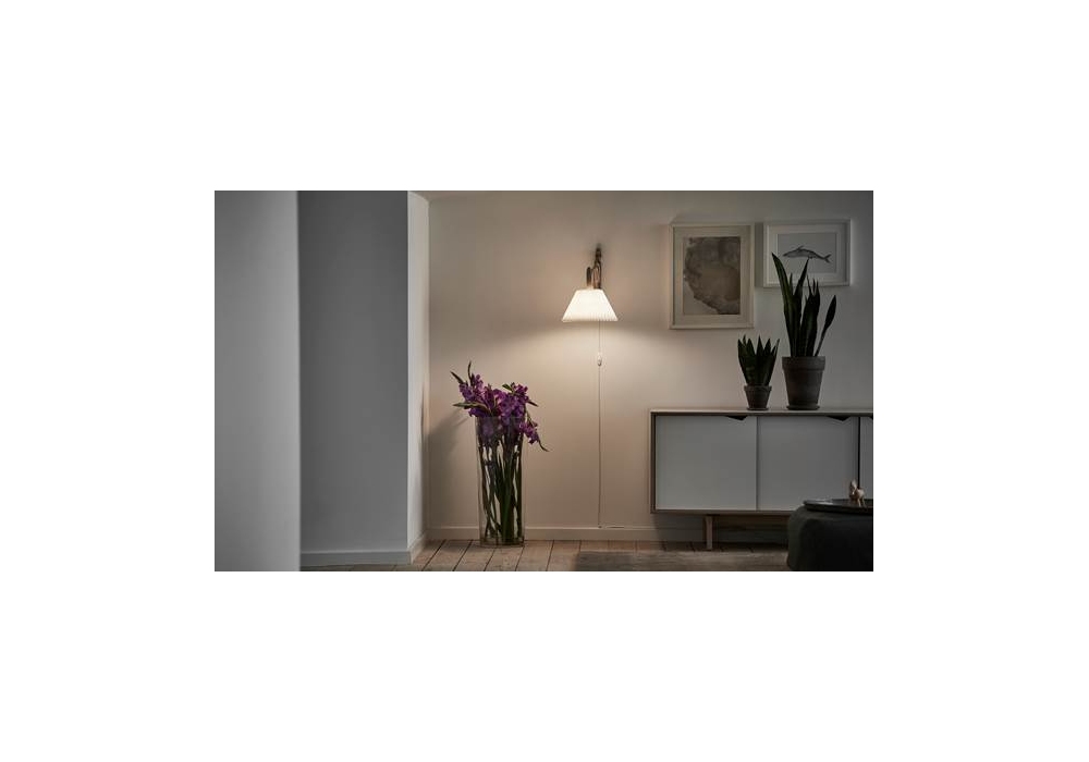 Sax 223 designed by Erik Hansen for Le Klint is a wall lamp composed of the combination of metal, wood, plastic and paper material. Structured with a pantograph system it allows to have a very versatile lamp giving depth and at the same time reduced and compact dimensions. The lampshade is circular in shape, and enriched by a surface with regular and precise folds to ensure optimal light diffusion. The light source used is LED or halogen (not included), powered by a cable covered in white plastic. Sax 223 is available in different wood finishes, and with lampshade in plastic and refined paper.