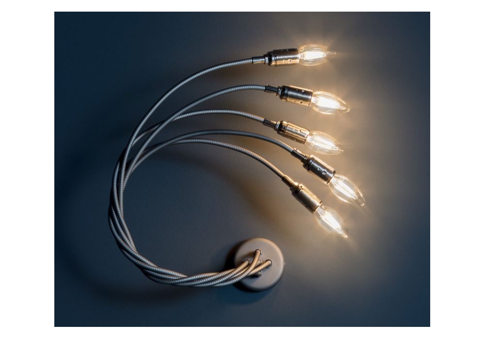 Turciù 5 designed and produced by Catellani & Smith is a wall lamp with satin metal base, moldable flex in brass or nickel.