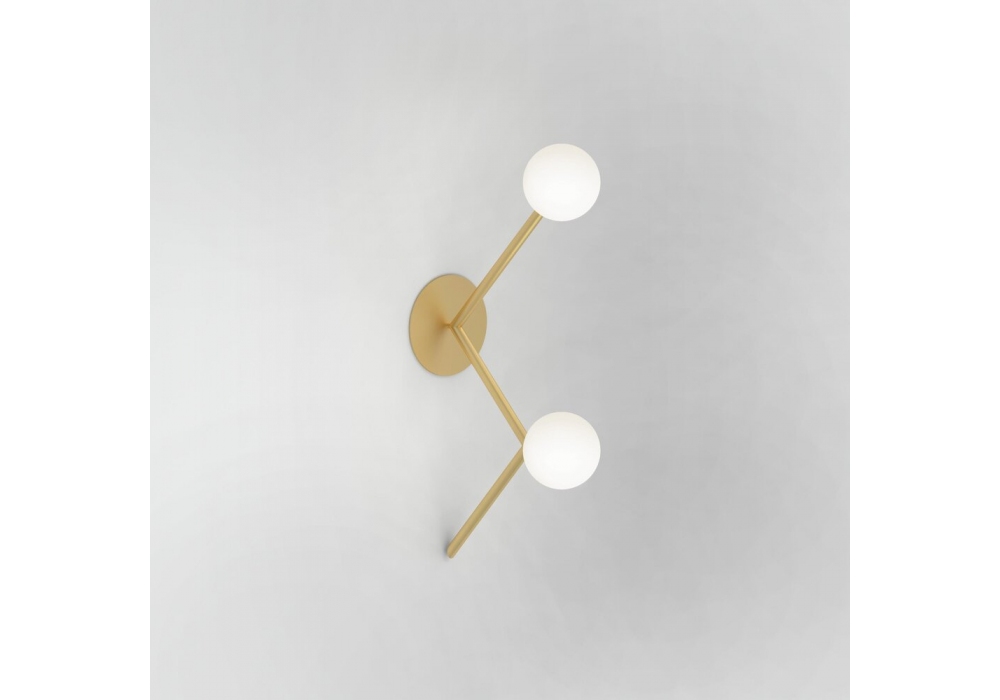 Zigzag designed by Atelier Areti is a wall lamp made of brushed brass and two white glass diffusers.